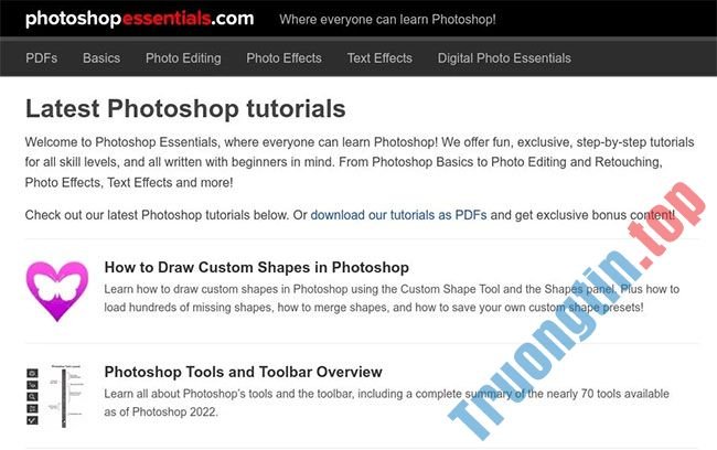 Photoshop Essentials là một nguồn tài nguyên miễn phí tuyệt vời để học Photoshop. Nó cung cấp các hướng dẫn dưới nhiều danh mục để bạn cũng có thể dễ dàng tìm thấy những gì mình đang tìm kiếm. Bạn sẽ thấy các bài học về chỉnh sửa ảnh, hiệu ứng ảnh, hiệu ứng văn bản và nhiếp ảnh kỹ thuật số.