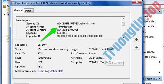 Các buổi lễ đăng nhập thành đạt có “Event ID: 4624 ” và đăng nhập thất bại là ” Event ID: 4625 “. Chỉ cần tìm các ID buổi lễ để tìm các thông tin đăng nhập và xem chính xác ngày và thời gian đăng nhập.