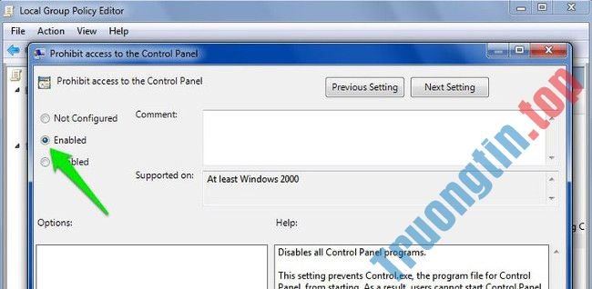 Trên cửa sổ Prohibit access to the Control Panel, click chọn tùy chọn Enable để chặn truy cập Control Panel. Bây giờ tùy chọn Control Panel sẽ được gỡ bỏ khỏi Start Menu và không một ai cũng đều có thể truy cập Control Panel được nữa, thậm chí ngay cả lúc mở Control Panel trên cửa sổ lệnh Run .
