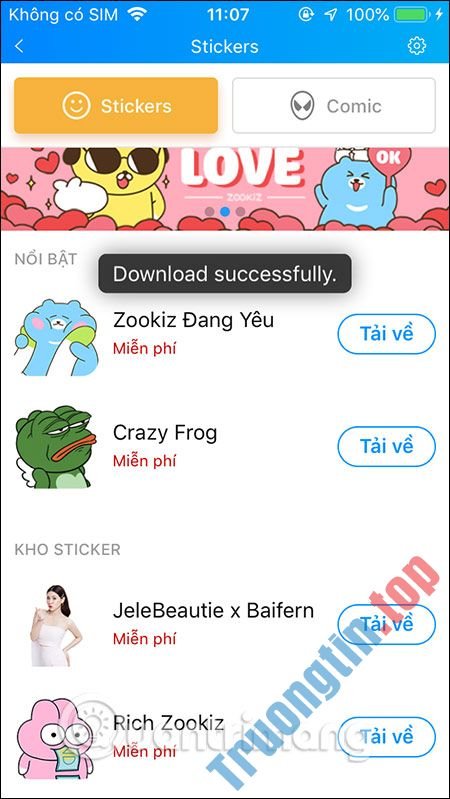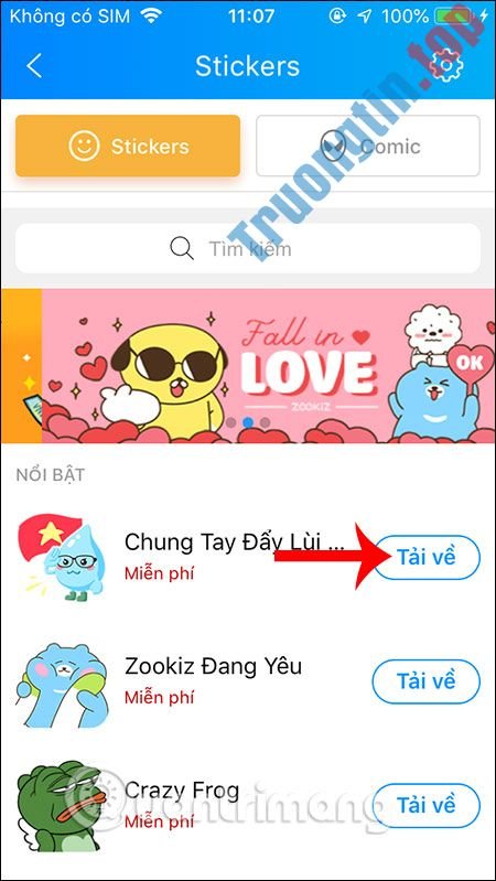 Trong kho sticker bạn sẽ nhìn thấy ngay bộ sticker mới “Chung Tay Đẩy Lùi Corona” ở ở trên cùng bản kê sticker, nhấn Tải về để tải bộ sticker mới này xuống Zalo của bạn.