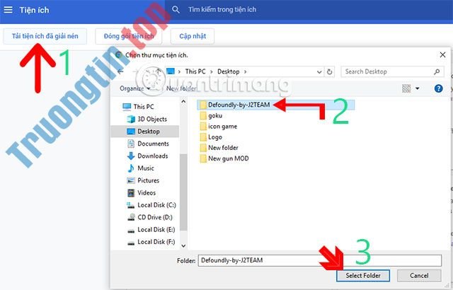Kế đến ban hãy bấm Tiện ích đã giải nén , sau đó chọn thư mục chứa tiện ích Defoundly đã tải về ở link trên và bấm Select Folder .