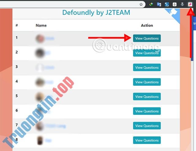 Đồng thời bây giờ bạn sẽ thấy biểu tượng tiện ích Defoundly trên thanh công cụ, nhấn vào đó và bạn sẽ thấy danh sách bạn bè của mình trên Facebook, nhấn vào View Question để xem câu hỏi của người đó. Nếu người đó chưa hỏi bạn thì bạn sẽ thấy thống báo màu đỏ.