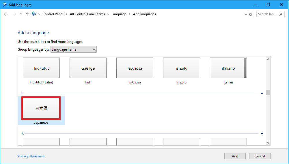 Trong cửa sổ Add Input Language , các bạn có thể nhấn phím “j” để nhảy đến gói ngôn ngữ Japanese (Japan). Sau đó nhấn OK để hoàn tất việc cài đặt.