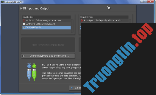 Trước khi bạn bắt đầu sử dụng Synthesia để học piano, bạn phải thiết lập bàn phím MIDI của bạn.Kết nối bàn phím MIDI vào máy tính, sau đó bật nó lên. Bắt đầu Synthesia sau đó chọn Keyboard Setup .Có 2 tùy chọn Input Devices và Output Devices , chọn bàn phím MIDI của bạn từ danh sách. Nếu bàn phím của bạn không xuất hiện trong danh sách, bạn đóng Synthesia. Quay trở lại trên bàn phím một lần nữa và khởi động lại Synthesia, và bàn phím của bạn sẽ xuất hiện trong cửa sổ thiết lập.