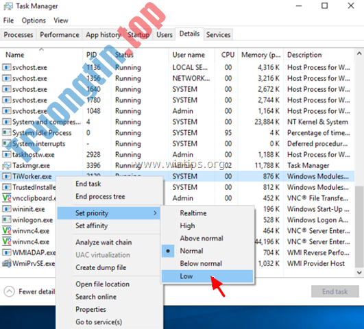 3. Kích chuột phải vào TiWorker.exe, chọn Set priority => Low.