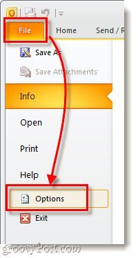 Trước tiên, các bạn mở Outlook 2010, nhấn File > Options :